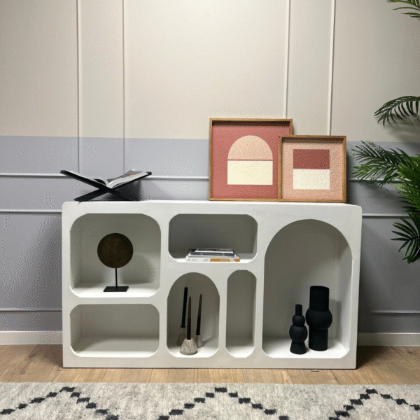 Dressoir Caya kenmerkt zich door zijn stijlvolle, organische vormen, waardoor het een absolute blikvanger is in jouw interieur. Met zes open vakken biedt de kast voldoende opbergruimte en worden al je decoratieve items direct zichtbaar. Het meubel is vervaardigd uit mangohout met een verfijnde witte afwerking. Dankzij zijn royale afmetingen en vormgeving is dressoir Caya werkelijk een eyecatcher. Afmetingen Breedte: 160 cm Diepte: 33 cm Hoogte: 90 cm Onderhoud: Afnemen met een lichtvochtige doek.
