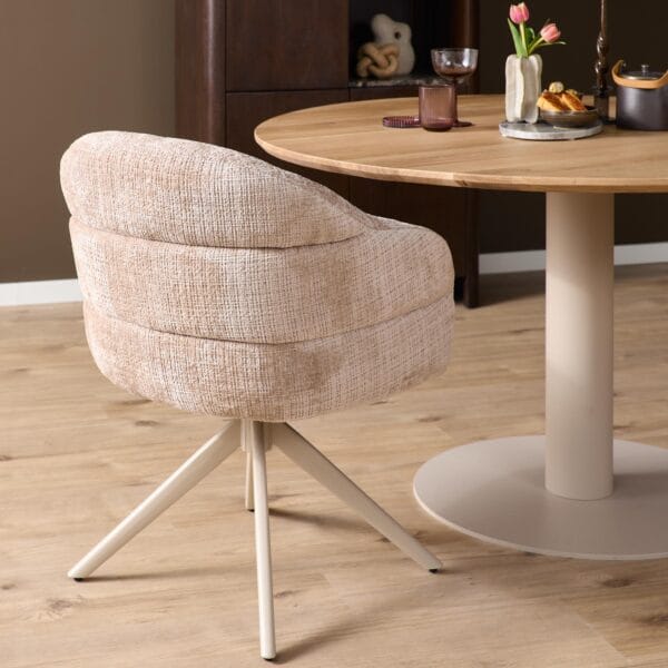 Eetkamerstoel Bella is uitgevoerd in een beige stof en heeft een metalen onderstel in de kleur sand. De stoel is voorzien van armleuningen, een draaibare zitting en een auto-return mechanisme. De combinatie van zachte bekleding en een lichte pootkleur zorgt voor een moderne en rustige uitstraling, terwijl de afgeronde rug met subtiele banen aan de achterzijde het ontwerp extra karakter geeft.