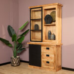 Vitrinekast Nashville is uitgevoerd in gelakt mangohout in combinatie met een zwart gelakt metalen deuren. Dit model is voorzien van twee deuren en zes lades. Deze kast is ingelegd met verschillende stroken hout, waar het meubel zijn eigentijdse karakter aan te danken heeft.